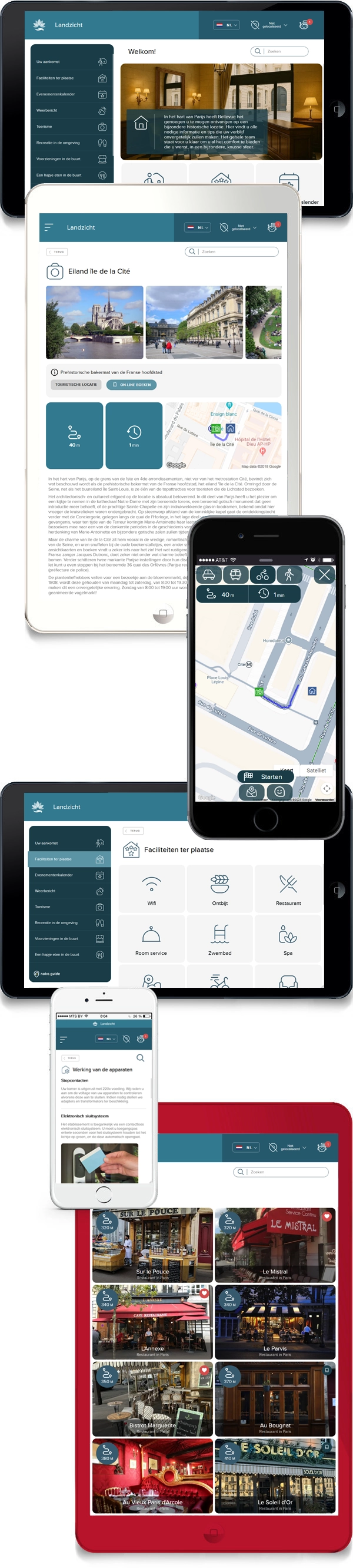 Het digitaal welkomstboekje notre.guide kan op ieder apparaat geraadpleegd worden; computer, tablet of smartphone. De interface is universeel, en vormt een samenhangend geheel op elke drager. Daarbij blijft de informatie zelfs offline toegankelijk, om onderbrekingen te voorkomen in zones met slechte dekking, of om hoge roamingkosten te voorkomen voor buitenlandse mobiele abonnementen. De dynamische weergave, programmeerbaar op groot een groot scherm, en het beheer van zuilen en eindstations maakt het mogelijk om informatie vanuit een centraal punt op andere dragers te verspreiden. Iedere zuil kan apart beheerd worden op de Administrator-account, en anders ingesteld, of op afstand gereset worden. Mocht het etablissement over een bar of restaurant beschikken, is het ook mogelijk om direct toegang te geven tot de restaurantmenu's, met behulp van een specifieke QR-code.